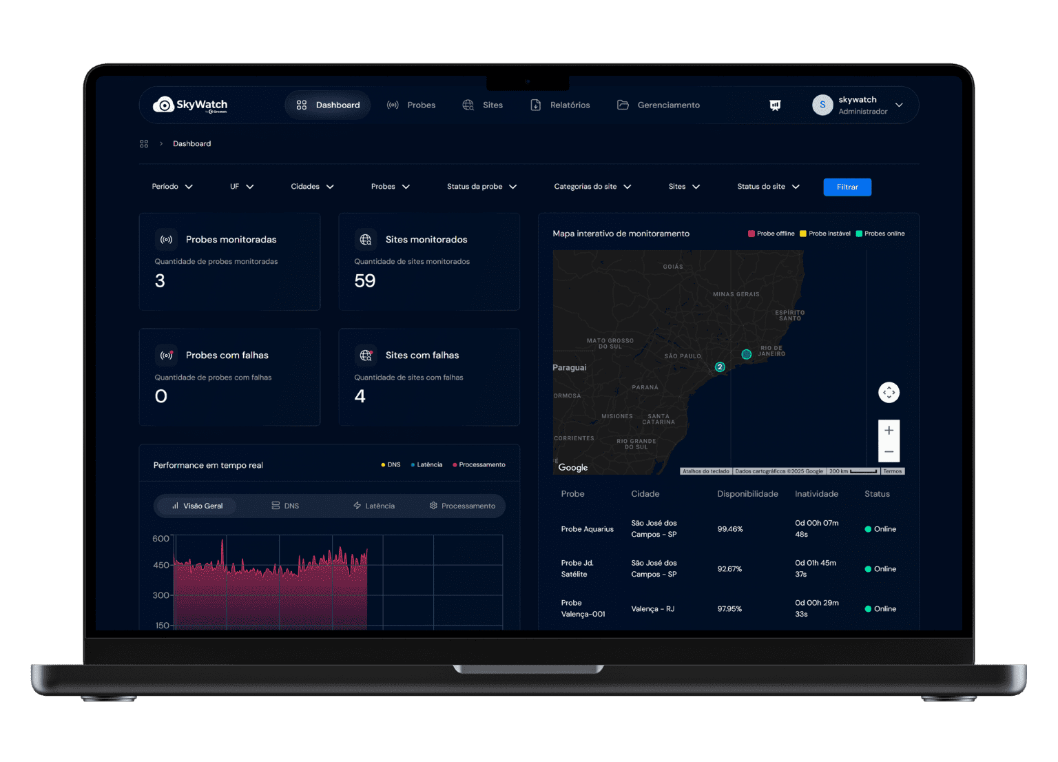 Instalando sondas em pontos estratégicos, o SkyWatch levanta métricas da sua rede e centraliza as informações em uma única plataforma. Com isso, sua equipe consegue garantir a qualidade e confiabilidade do serviço.